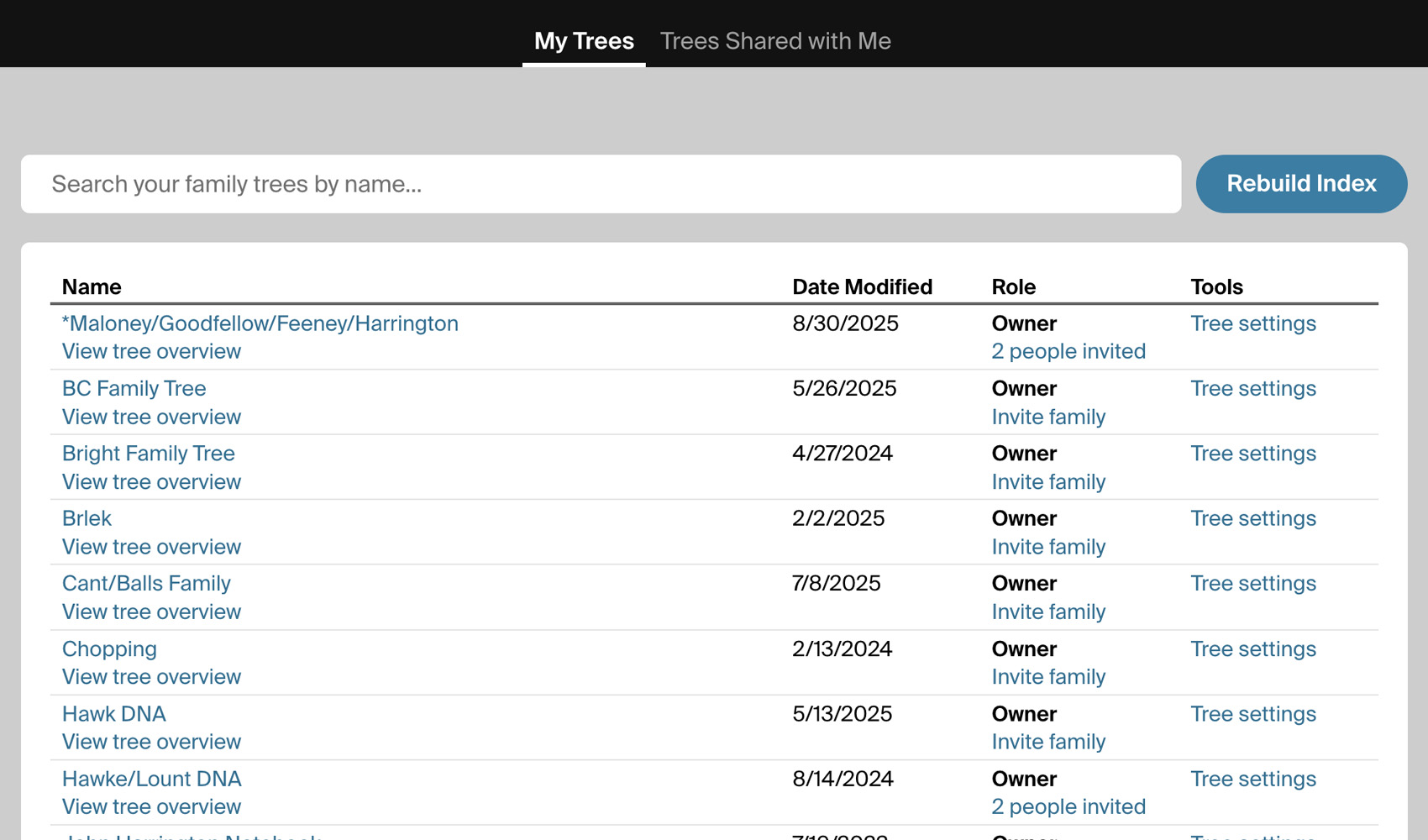 - At the top of the page, click on the Index Trees button and your family trees will be added to the searchable index.