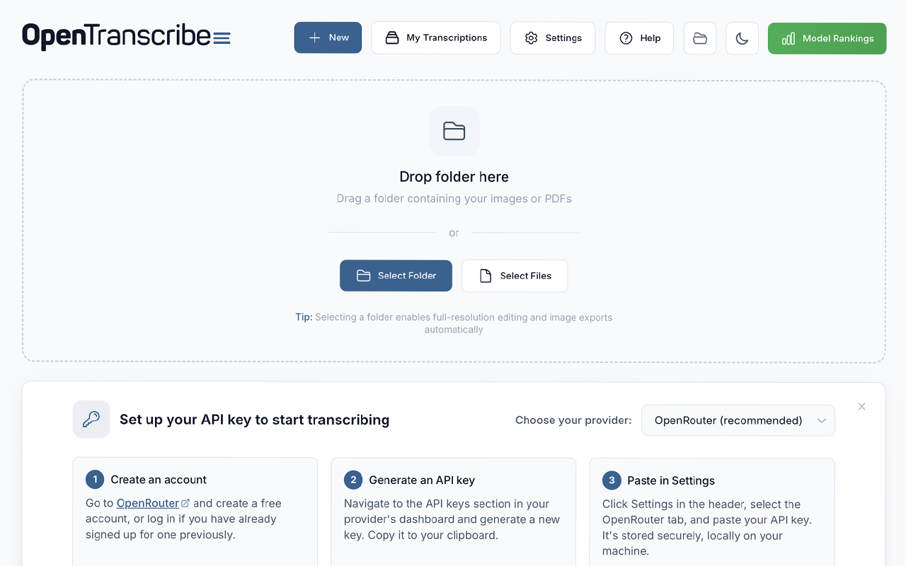 - Drag and drop entire folders into OpenTranscribe, enabling you to process thousands of images within a single batch.